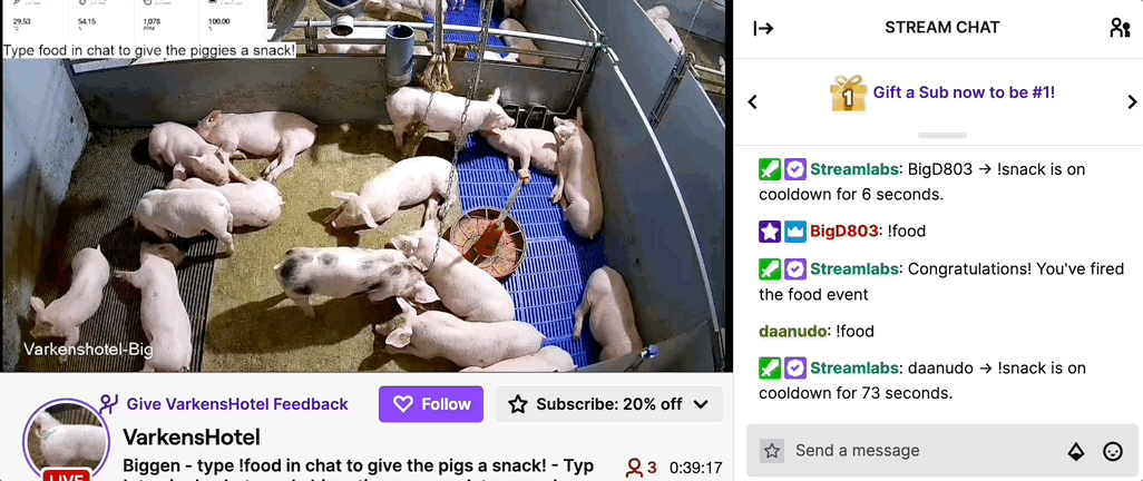如果您喜欢这些小猪,可以在聊天室中输入food给它们投喂零食!