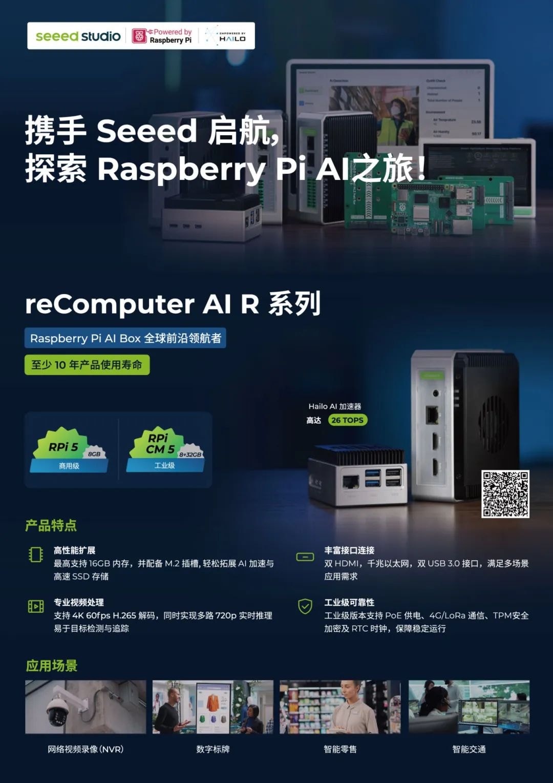 以下是我们展出的主要展品,从边缘AI设备,到树莓派AI Box到专业气象环境监测传感器等等,都是我们最新的产品以及技术,我们欢迎大家到我们展位来亲自体验并且共同探讨物联网+AI。