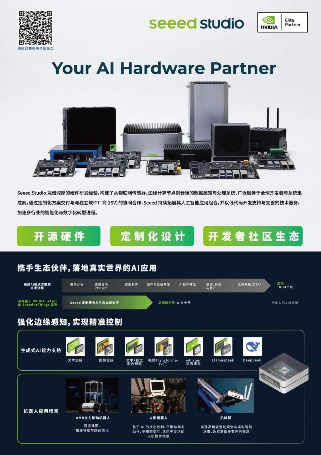 通过不懈努力和厚积薄发,我们不断丰富的产品线,现已布局崭新的 AI 应用场景 : 在边缘部署传感网络获取海量实时数据;利用边缘计算将人工智能推向全新领域。我们提供工业级模块和设备,并通过 Fusion 服务开放从原型设计到批量生产和市场推广的全流程能力。携手不同垂直领域的创新者,将创新方案推向广阔市场。本次亮相IOTE,矽递科技将展出最新AI硬件,涵盖模组/设备/解决方案。