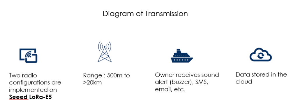 传输范围从500米到超过20公里不等,具体取决于安装高度和障碍物。警报通知从设备发出后,船主将立即收到声音警报(蜂鸣器)、短信、电子邮件等。最终,所有传感器数据都存储在云端,便于后续评估访问。