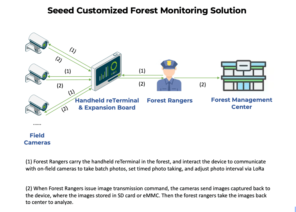 具体而言,这一设备的主要功能是赋能森林巡护员,使他们能够通过LoRa模块向部署在森林中的摄像头发出指令。通过reTerminal,巡护员可以远程控制摄像头拍照并接收图像传输,这些图像保存在reTerminal的SD卡或eMMC中,供数据中心进行后续分析。