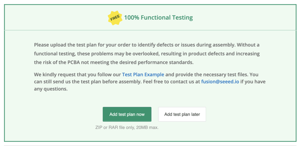 完成上述步骤后,导航到下方的功能测试部分,选择[100%功能测试]。然后,上传测试计划,指导我们如何测试电路板功能是否符合预期。您也可以稍后在电路板完成之前上传测试计划。