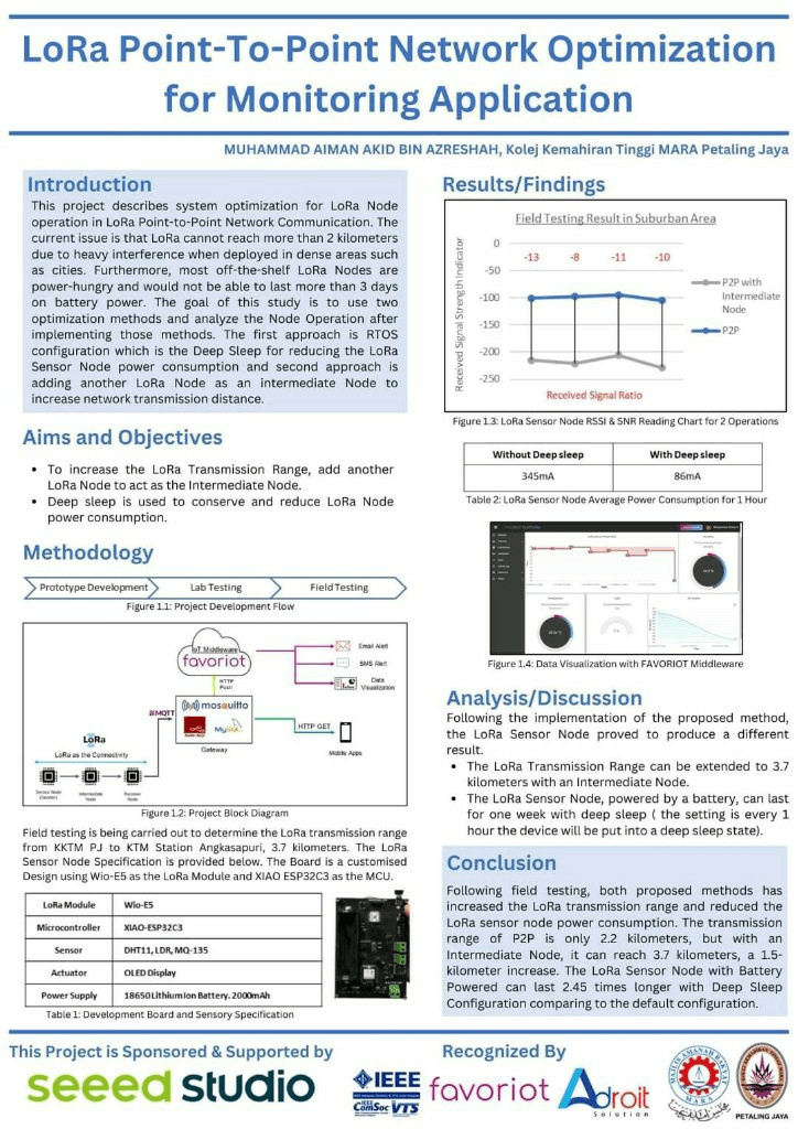To improve the situation of high dependence on power and the narrow transmission range of LoRa® in the urban area, Aiman Akid deployed an optimization project for LoRa® point-to-point network. The purpose of the project is to build two optimization strategies and then assess the node’s operation. The first is the RTOS approach, which is Deep Sleep, to minimize the power consumption of the LoRa® sensor node. And the other is adding another LoRa® node as an intermediary node to extend the network transmission distance. To view the original project on hackster.io, please refer here.