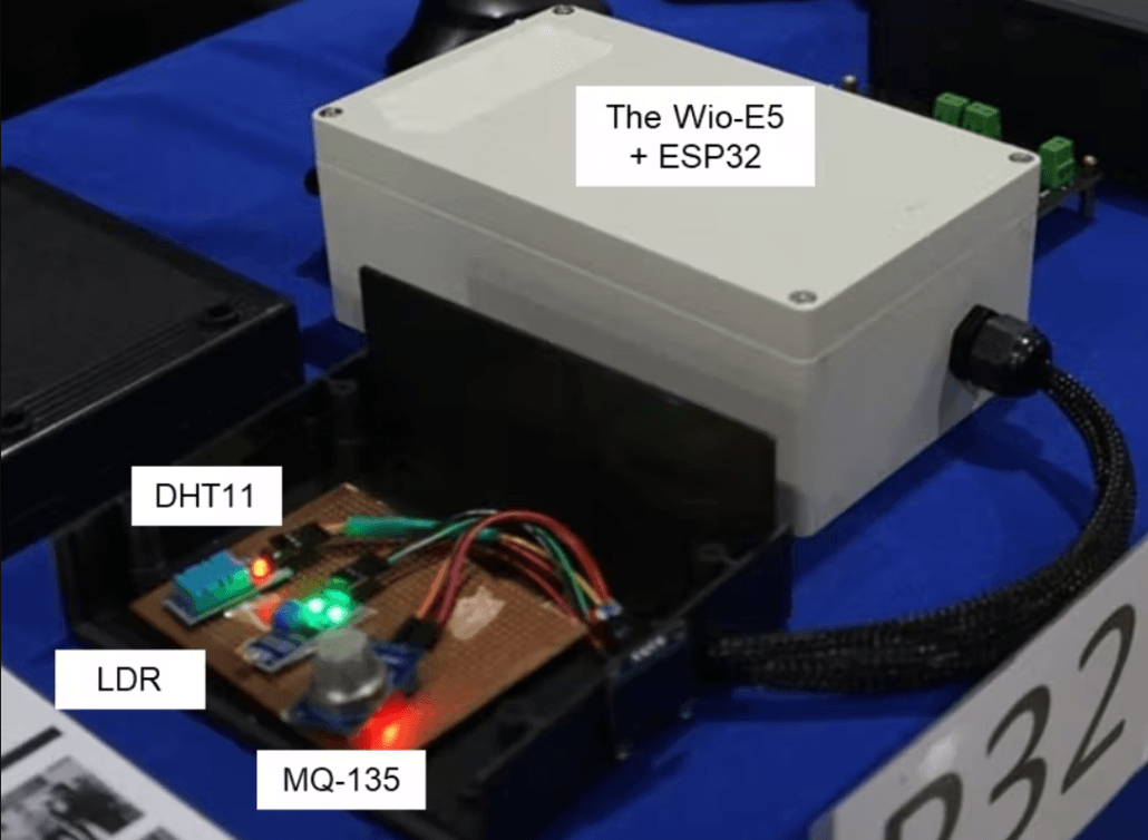 This DIY LoRa® sensor node serves as the LoRa® sender. The White Box contains The Wio-E5 + ESP32 Development Board: Grove Wio-E5 and Hibiscus Sense (ESP32), while the Black Box contains 3 types of sensors: