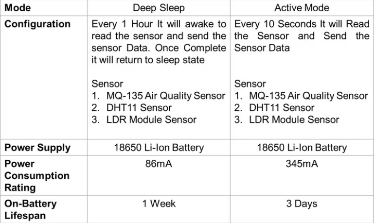 Aiman used a multimeter to measure the currents of the Board and the sensor to determine power usage. Here is the result of the one-hour measurement. The battery used is a 18650 Li-Ion battery with a capacity of 2000mAh.