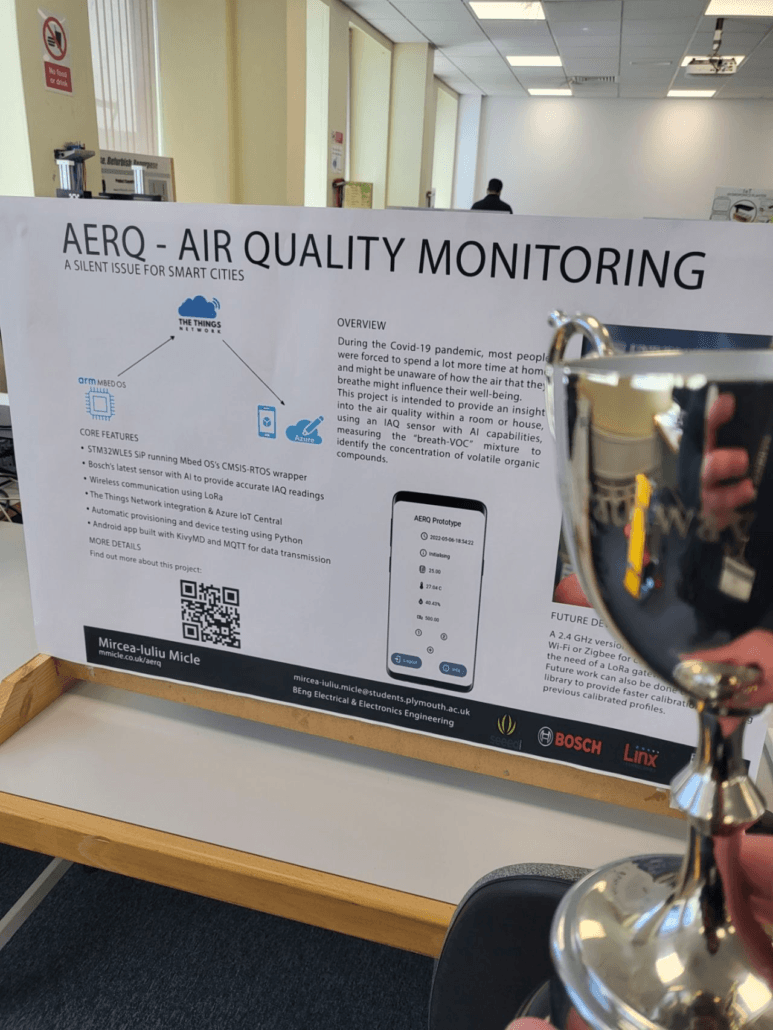最新消息!这太棒了!热烈祝贺 Mircea-Iuliu Micle 凭借其出色的项目”AERQ-室内空气质量监测器”荣获普利茅斯大学工程学士 pathway 奖!我们非常高兴能有机会支持他基于Seeed Wio-E5模块和Fusion PCB组装服务的项目!
