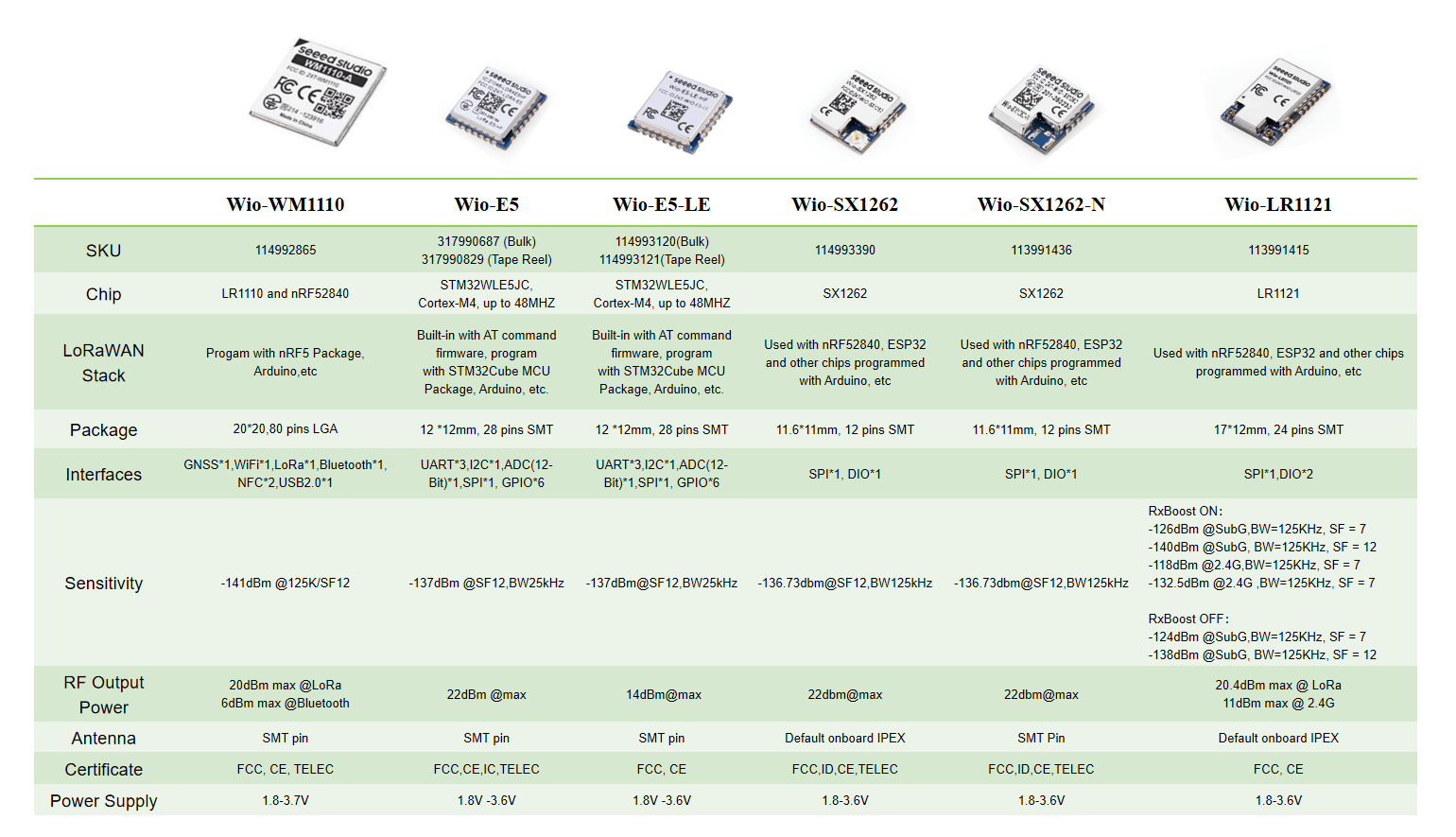查看下表,比较本次赞助中展示的SeeedLoRa模块的规格和功能。