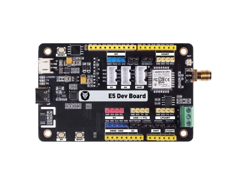 Wio-E5开发套件嵌入了Wio-E5 STM32WLE5JC LoRa模块,支持全球频段的长距离协议。它提供完整的GPIO,支持各种数据协议和接口,如RS485、Grove、公/母排针等。这使得它非常用户友好,因为它允许与其他设备或组件进行轻松灵活的连接。它将是您快速测试和快速原型开发长距离物联网项目的完美选择。