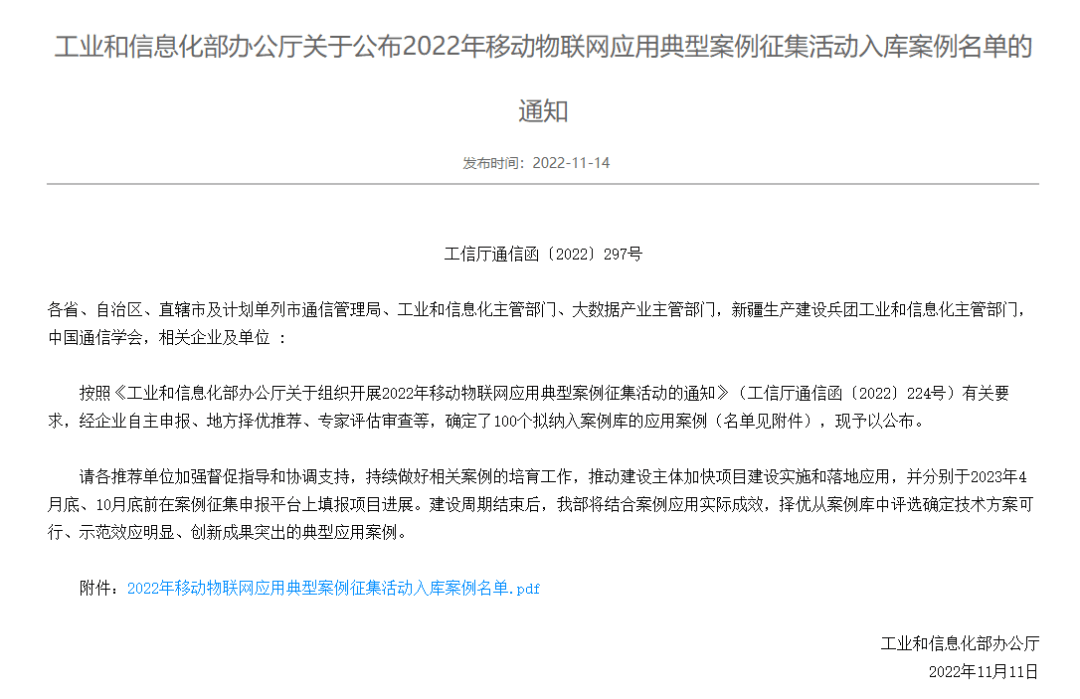 22年9月,工信部印发《关于组织开展2022年移动物联网应用典型案例征集活动的通知》,围绕智能家居、网联汽车、智能穿戴等领域的生活智慧化应用,智慧农业、智能工厂、智慧医疗等领域的产业数字化应用,智慧消防、环保监测、智能表计等领域的治理智能化应用,征集优秀案例,全国共遴选 100 个拟纳入库应用案例,在技术、成效、应用前景方面表现突出,可借此发挥典型作用,进一步提升移动物联网应用广度和深度。