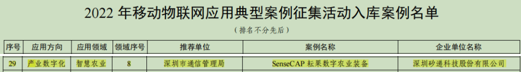 11月11日,“2022年移动物联网应用典型案例”评选结果出炉,我司“SenseCAP耘果智能传感系统”成功入选。