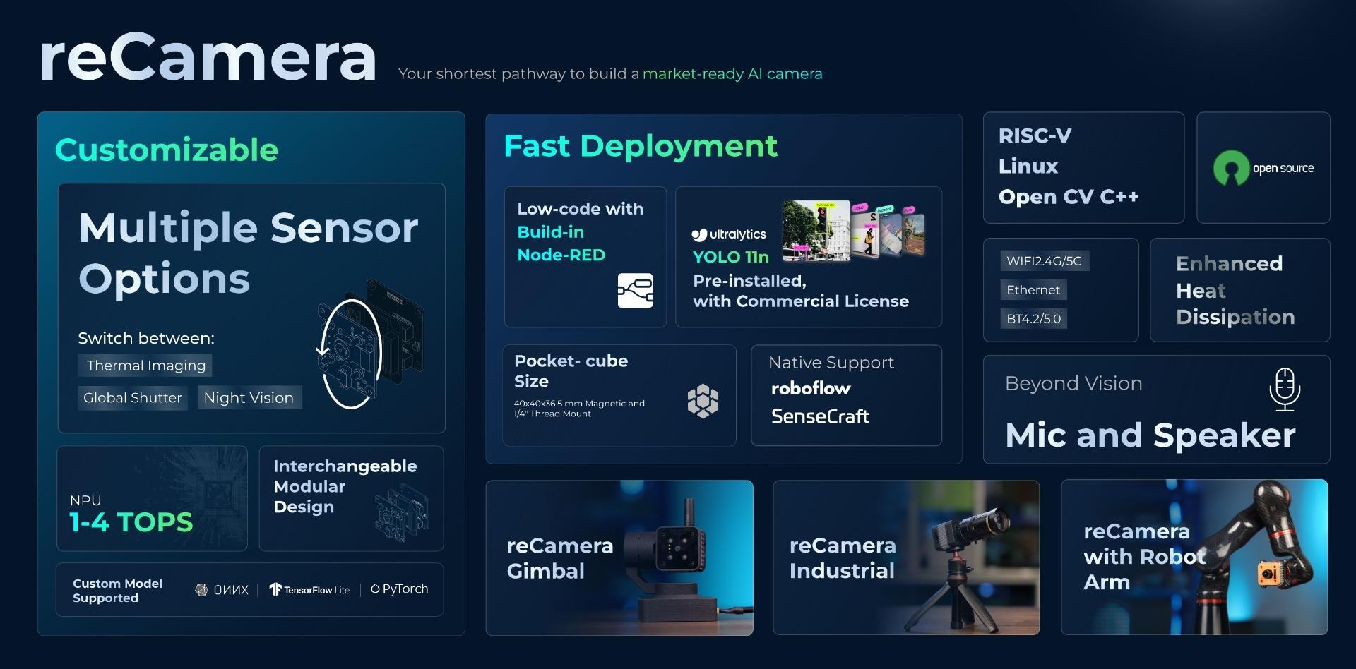 | reCamera 2002w 64GB | SG2002 1TOPS@Int8 | 64GB eMMC | Wi-Fi 2.4G/5G + BT 4.2/5.0 | 40×40×36.5mm |