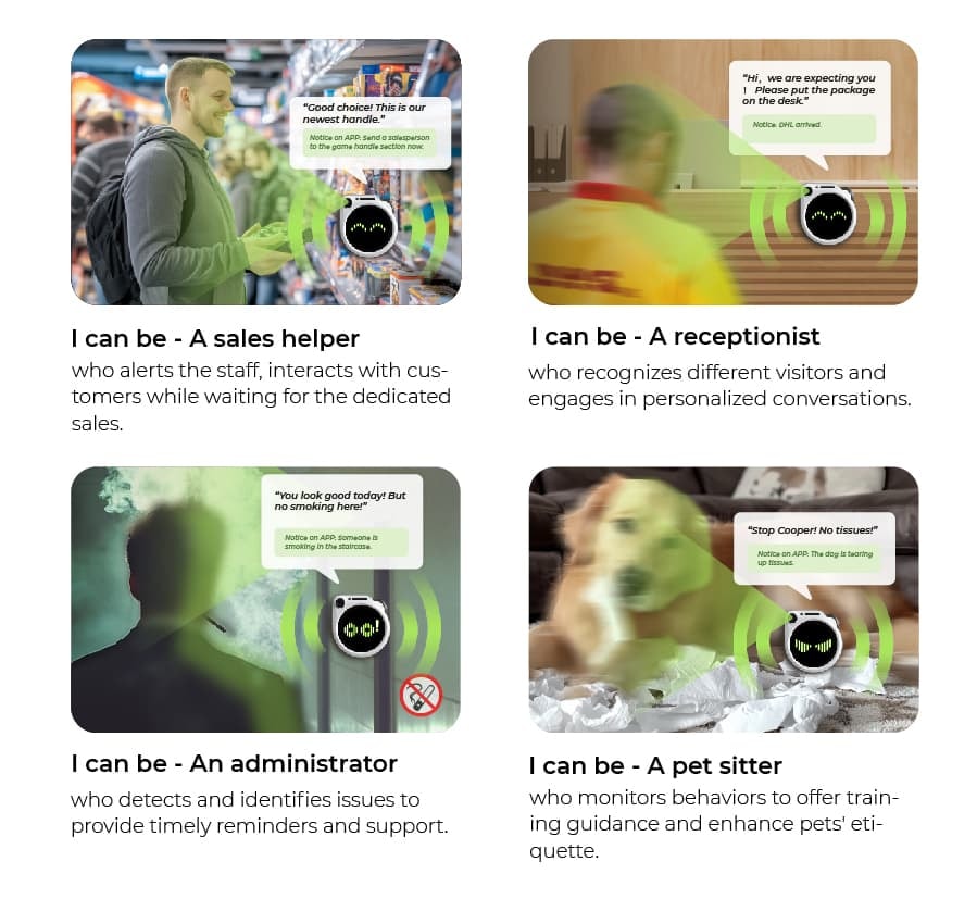 将Watcher放在不同场景中可以实现多样化的响应。看到狗撕纸时,说"停下,Cooper!",看到有人在禁烟区吸烟时,说"禁止吸烟!"