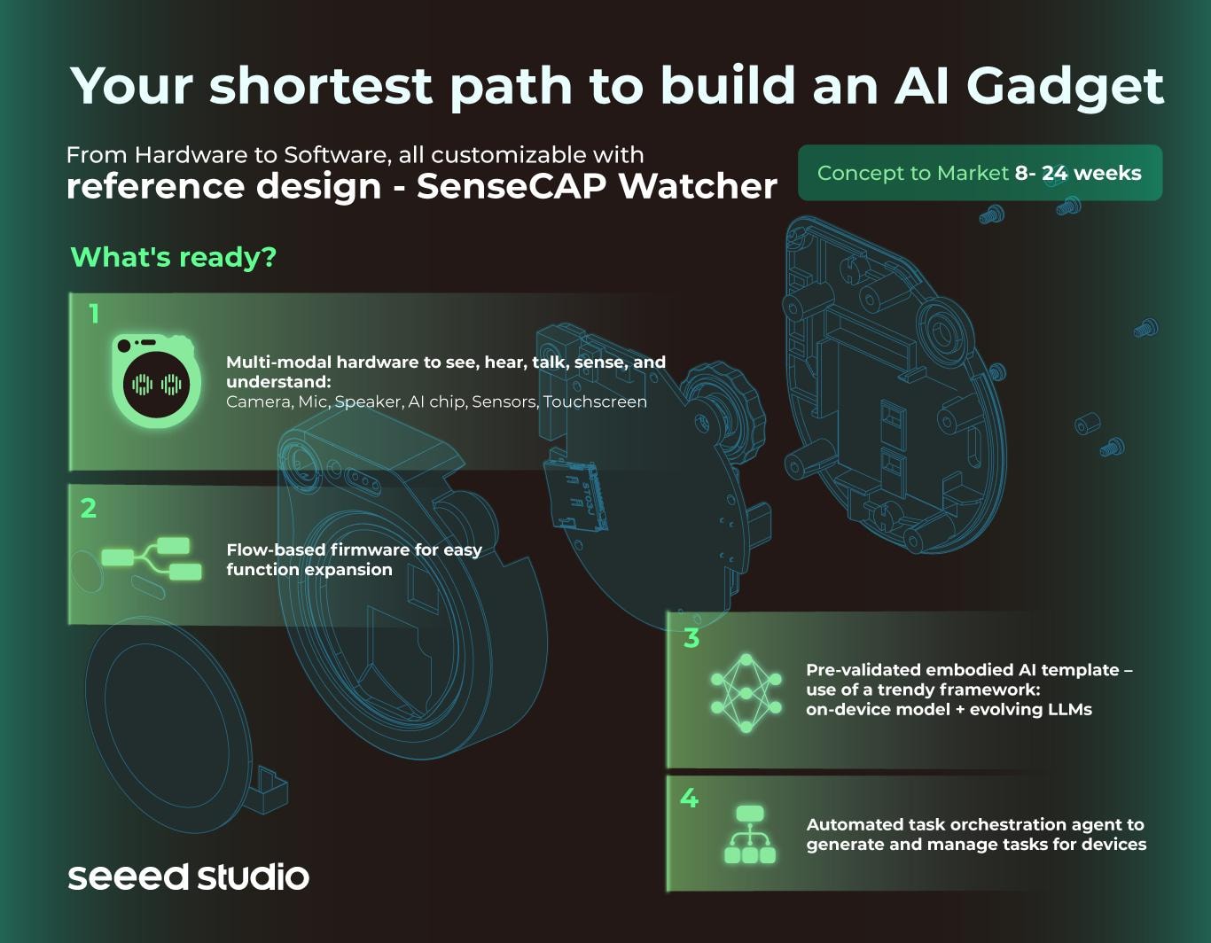 使用SenseCAP Watcher,我们开发了一个革命性的框架,将强大的LLM带到物理世界的最边缘。这个框架加速了AI硬件原型制作。通过我们的定制服务,您可以比以往任何时候都更快地让您的AI硬件栩栩如生!