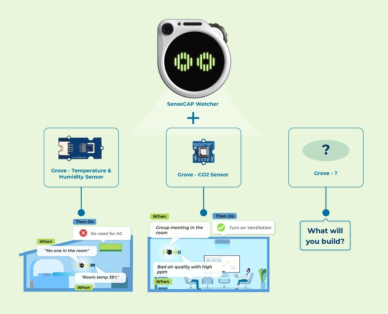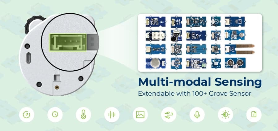 Watcher不仅是视觉传感器,更支持多模态传感器融合。设备背部预留的I2C接口可连接100多种Grove传感器模块。这种开放的扩展性让Watcher能够融合多维度数据进行综合分析和智能决策。您可以构建诸如"智能温控"的应用——检测到穿西装的人时将空调调至22°C,识别到穿短裤时调至26°C。