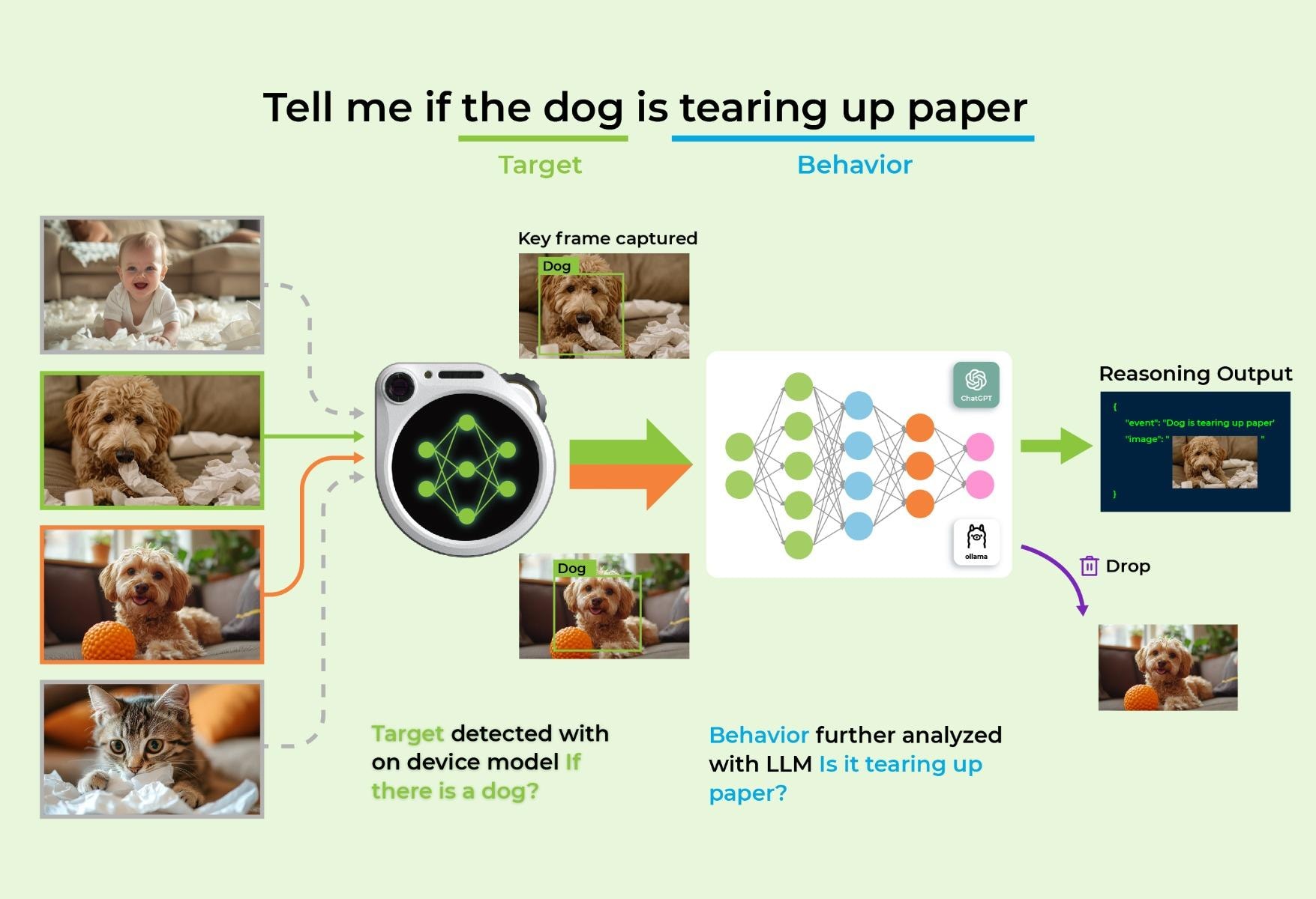 以"检测狗是否在撕纸"为例,当端侧模型识别到狗的存在时,才会将关键画面发送至LLM进行行为分析——确认是否在撕纸。这样避免了人、猫、松鼠等其他目标的误触发,实现成本的精准控制。