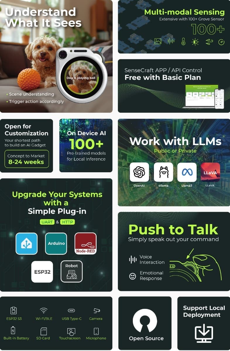 搭载高性能端侧AI推理引擎,SenseCAP Watcher能够实时识别多种物体:人员、物品、宠物等。但Watcher的真正革命性在于其与大语言模型的深度融合。