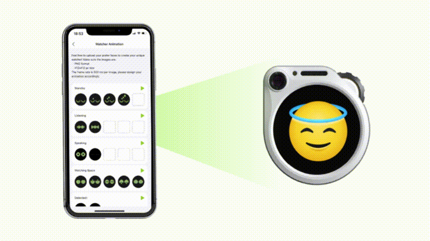 SenseCAP Watcher通过直观的"状态模式"来响应您的指令。从"聆听"指令状态到"监控"执行状态,每个模式都有专属的视觉表达。更令人兴奋的是,您可以上传个性化的表情包,让Watcher拥有独一无二的个性化外观。只需准备PNG格式的表情文件,几秒内即可完成上传!让Watcher真正成为您的专属智能助手!